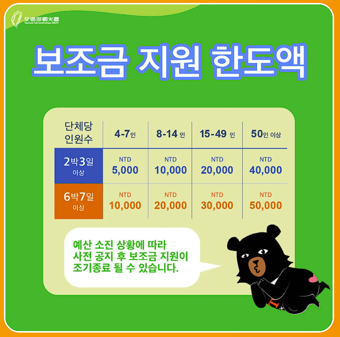 단체투어의 대만 여행지원금은 투어 그룹 구성원 수와 체류 기간에 따라 투어단체 당 5,000~50,000 NTD의 비용이 지급됩니다.